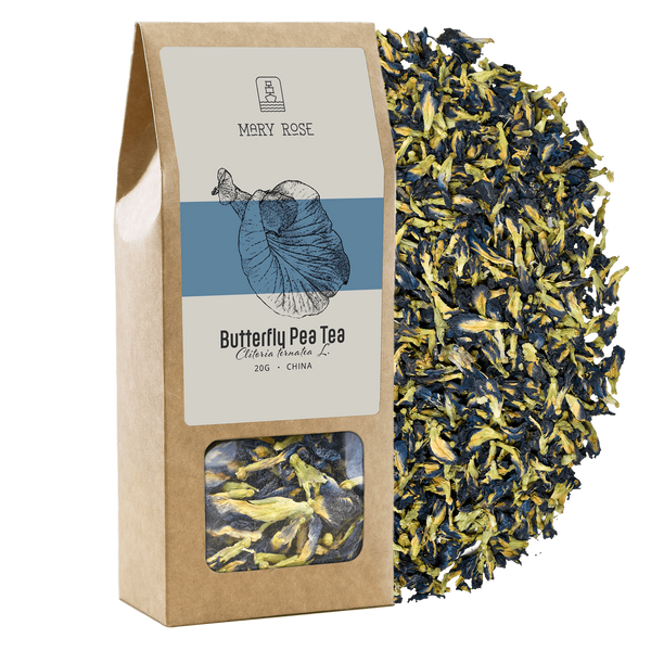 - Mary Rose - Butterfly Pea Tea, also die Blüten der Blauen Klitorie. Ein Aufguss aus Blütenblättern der Blauen Klitorie hat eine schöne, blaue Farbe, deshalb wird er als blauer Tee bezeichnet.