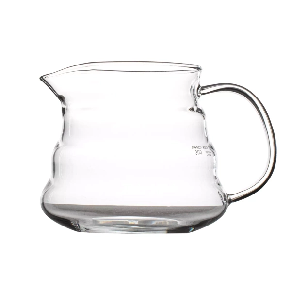 Server, also eine spezielle Kaffeekanne zum Servieren des Kaffees. Sie dient als Gefäß, in dem Sie Kaffee aus einem Dripper aufbrühen können, aber auch als praktische, stilvolle Kanne zum Servieren von Kaffee und anderen heißen Getränken. Sie fasst etwa 350 ml Flüssigkeit. Die Kanne ist aus hitzbeständigem Glas gefertigt, so dass sie ihre Temperatur länger hält und gleichzeitig verhindert, dass die Außenseite Ihre Hände verbrennt. Sie ist mit einem praktischen Griff ausgestattet, der das Umfüllen von Getränken in Becher oder Tassen erleichtert.