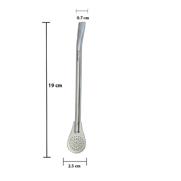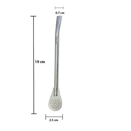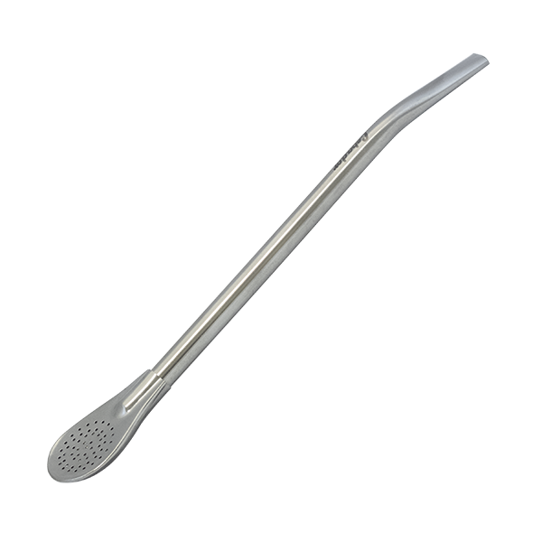 Eine der beliebtesten Bombillas unter Zubehören für Mate Tee. Eine sorgfältige hergestellte Bombilla, leicht gekrümmt für Gebrauchszwecke. Das einfache Design ermöglicht eine gute Filterung und ein problemloses Trinken fast aller Sorten von Mate Tee.