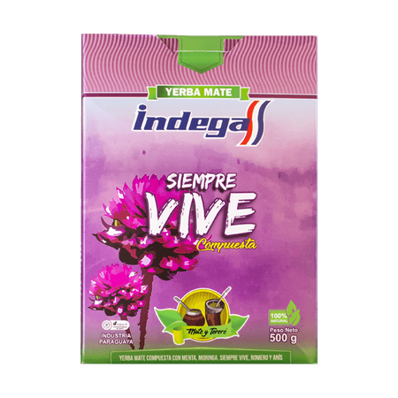 - Mate Tee Indega Siempre Vive ist eine aromatische Mischung mit dem Geschmack von fünf Kräutern: Meerrettichbaum , Rosmarin und Anis, Strandflieder und Pfefferminze.
