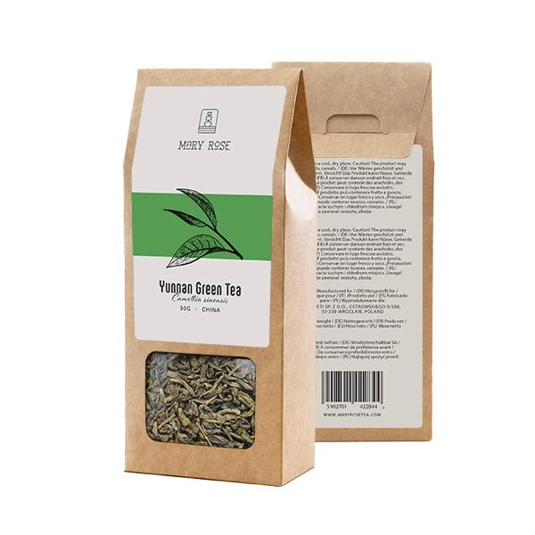 Grüner Tee Yunnan der Marke Mary Rose stammt aus der südwestchinesischen Provinz, die eigentlich diesen Namen hat. Die Mischung besteht aus sanft gerollten Blättern mit einem Durchschnittsgewicht. Nach dem Aufbrühen hat der Aufguss ein kräftiges Teearoma und ist kupferfarben. Die Intensität des Geschmacks verursacht, dass Tee sehr oft in verschiedenen Geschmacksvarianten mit anderen Zusätzen vorkommt.