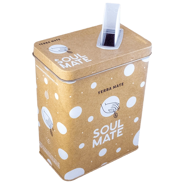 Sie suchen nach einer praktischen Aufbewahrungsmöglichkeit für Ihre Lieblings-Mate-Tee? Entscheiden Sie sich für Soul Mate Orgánica Elaborada in einer Metalldose - Yerbera mit praktischem Spender, der die Blätter frisch hält und das Portionieren erleichtert! 🌿💚